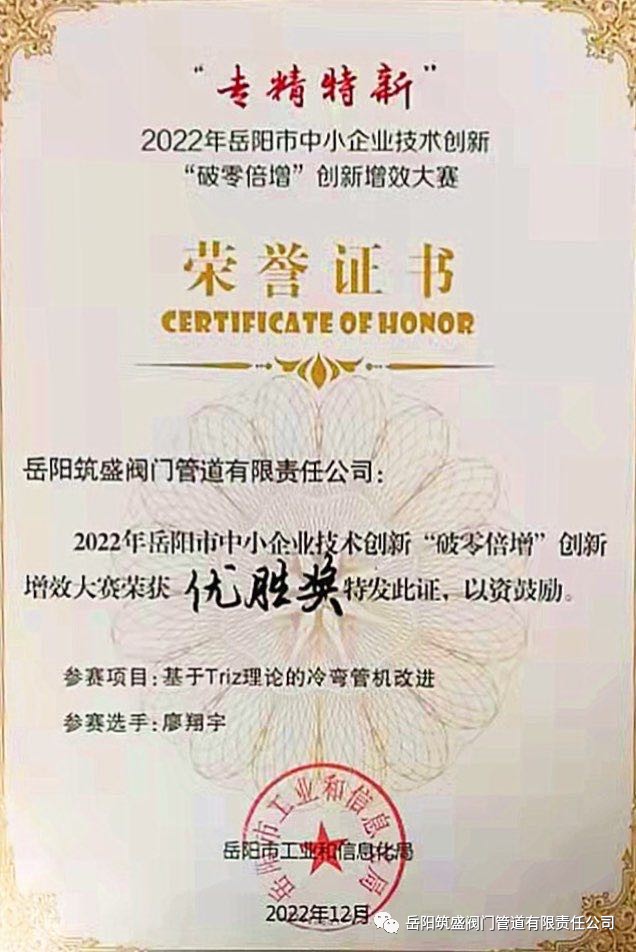 岳筑宣2022年12月6日訊:2022年12月5日我公司委派技術(shù)部廖翔宇工程師參加了2022年岳陽市“專精特新”中小企業(yè)技術(shù)創(chuàng)新“破零倍增”創(chuàng)新增效大賽基于Triz理論的冷彎管機改進項目中榮獲優(yōu)勝獎!